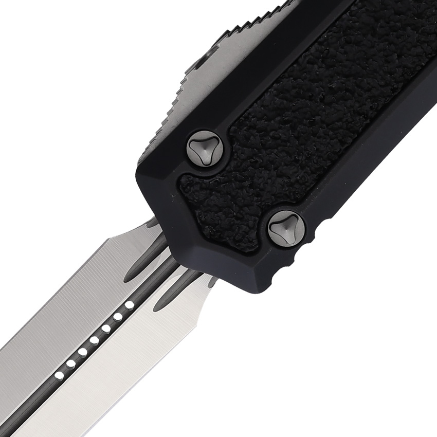 The Microtech Knives Auto Makora D/E OTF Satin boasts a 3.38″” blade made from premium steel. The double edge design and satin finish add to its overall appeal and functionality. The handle, made from black aluminum, ensures a firm grip and enhances durability. The knife also features a glass breaker and a lanyard hole for added utility.