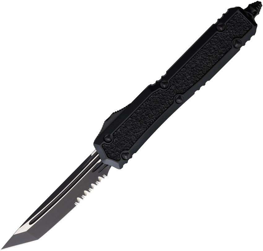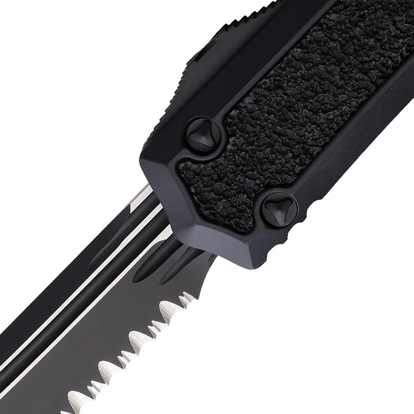 Automatic opening. 5.13″” (13.03cm) closed. 3.38″” (8.59cm) two-tone finish partially serrated stainless tanto blade. Black aluminum handle. Glass breaker. Lanyard hole. Pocket clip. Nickel Boron internals. Boxed.