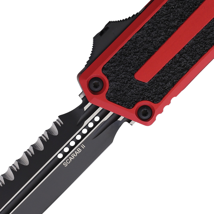 Microtech Knives Auto Scarab II OTF D/E Gen III, a premium automatic knife designed for the discerning user. Crafted in the USA, this knife is a testament to Microtech’s commitment to quality and performance. Its red aluminum handle and two-tone finish partially serrated dagger blade make it a standout in any collection.