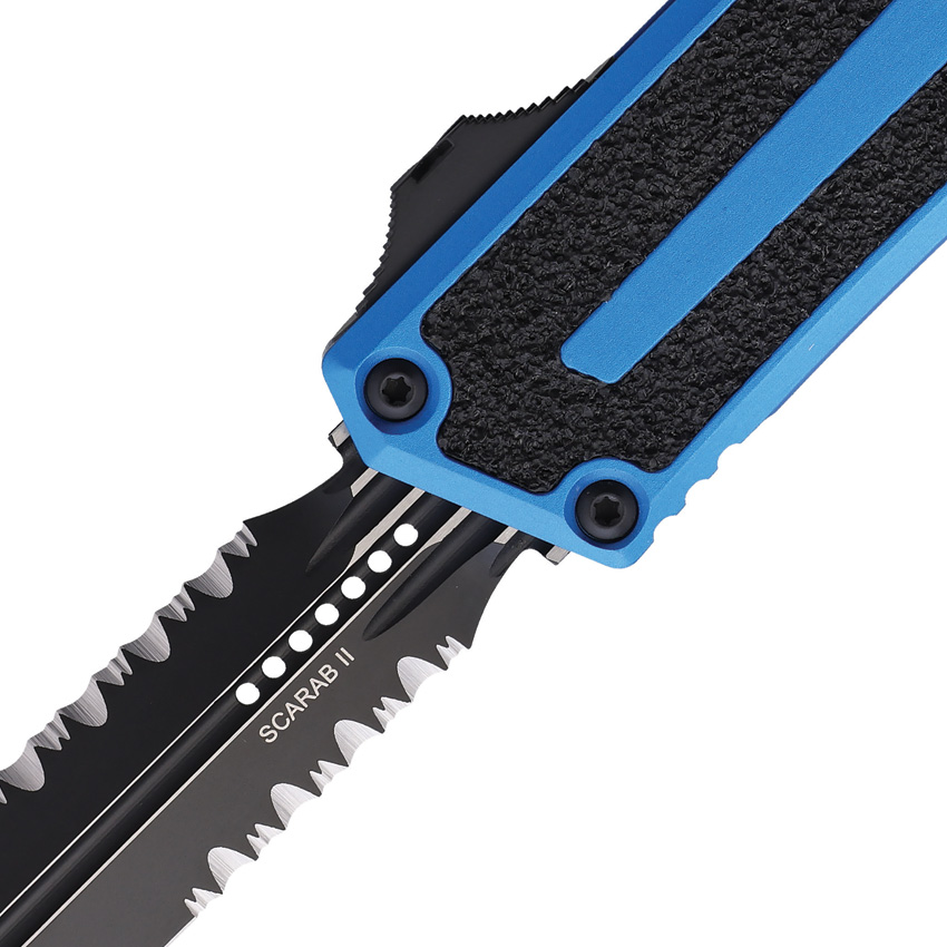 The Auto Scarab II OTF D/E Gen III is a standout offering from Microtech Knives. Its automatic opening mechanism ensures swift, effortless deployment of the blade. The two-tone finish and partial serration of the premium steel dagger blade add to its visual appeal and functional versatility. The blue aluminum handle is fitted with a black traction insert for a firm, comfortable grip.