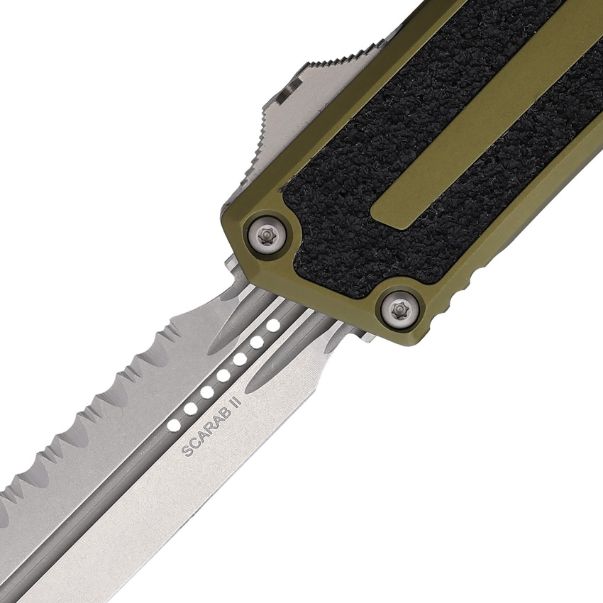 Microtech Scarab II D/E OTF Automatic Knife, a robust and versatile tool designed for everyday carry. This knife is a perfect blend of functionality and style, featuring a powerful double spring system and a unique ‘crud cutter’ for smooth operation.