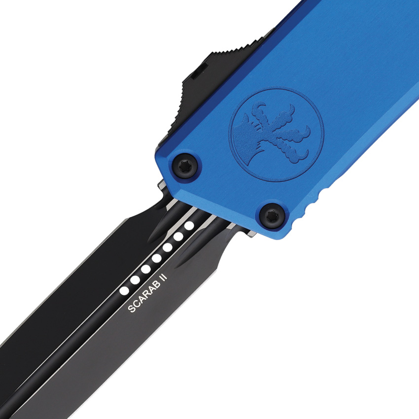 Automatic opening. 5.75″ (14.61cm) closed. 3.9″ (9.91cm) two-tone finish double edge Bohler M390MK stainless dagger blade. Blue aluminum handle. Glass breaker. Lanyard hole. Pocket clip. Boxed.