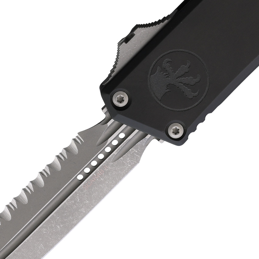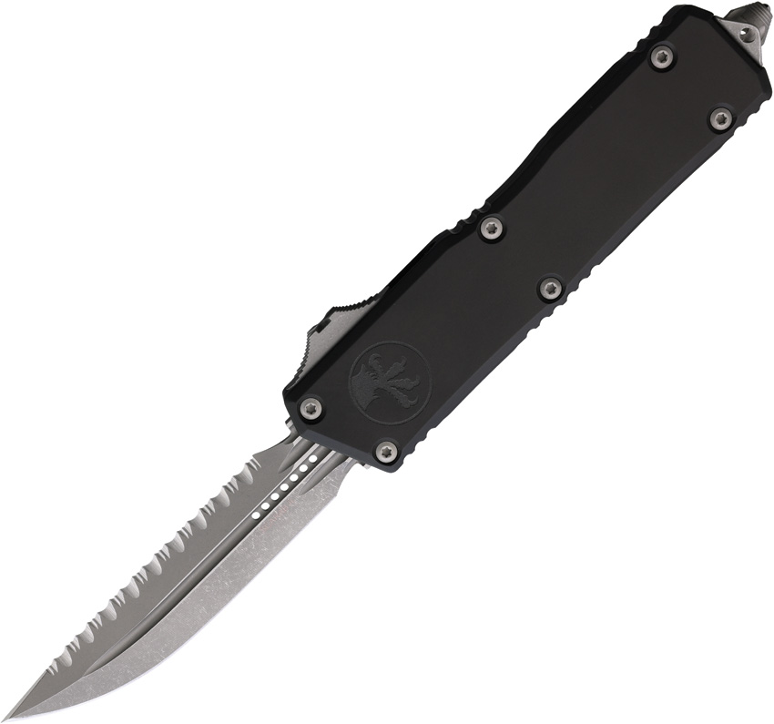 Automatic opening. 5.75″ (14.61cm) closed. 3.9″ (9.91cm) Apocalyptic finish serrated Bohler M390MK stainless blade. Black aluminum handle. Glass breaker. Lanyard hole. Pocket clip. Boxed.