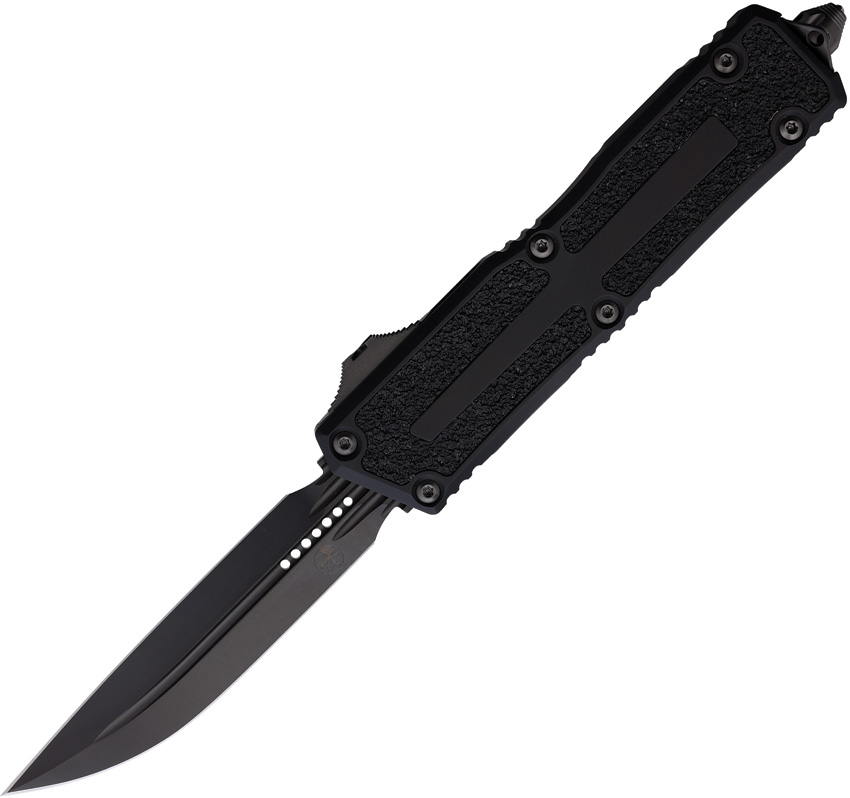 Automatic opening. 5.75″ (14.61cm) closed. 3.9″ (9.91cm) black DLC coated partially serrated Bohler M390MK stainless blade. Black aluminum handle with black traction insert. Glass breaker. Lanyard hole. Pocket clip. Boxed.