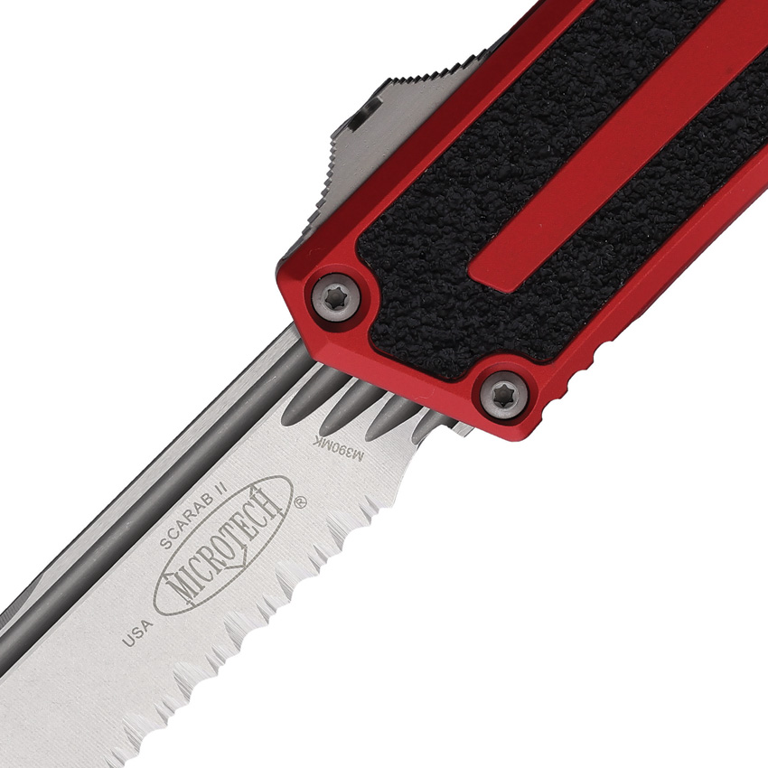 The Microtech Knives Auto Scarab II OTF S/E Gen III is an automatic knife that stands out for its robust construction and practical features. The knife’s blade is made from Bohler M390MK stainless steel, known for its excellent edge retention and corrosion resistance. The blade is partially serrated, making it suitable for a variety of cutting tasks.