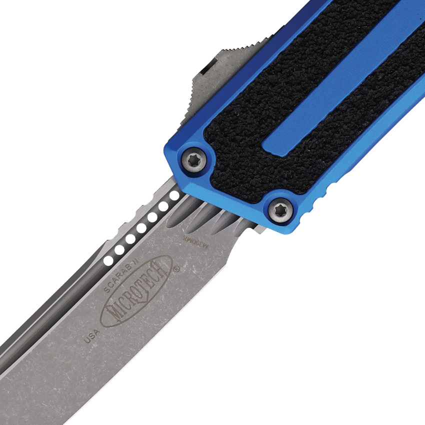 Microtech Scarab II Gen III T/E OTF Automatic Knife Blue Aluminum (4″” Apoc), a tactical masterpiece designed for the discerning user. This knife embodies the best of Microtech’s renowned knife styles, offering a powerful and smooth double spring system, capable of firing the blade even underwater.