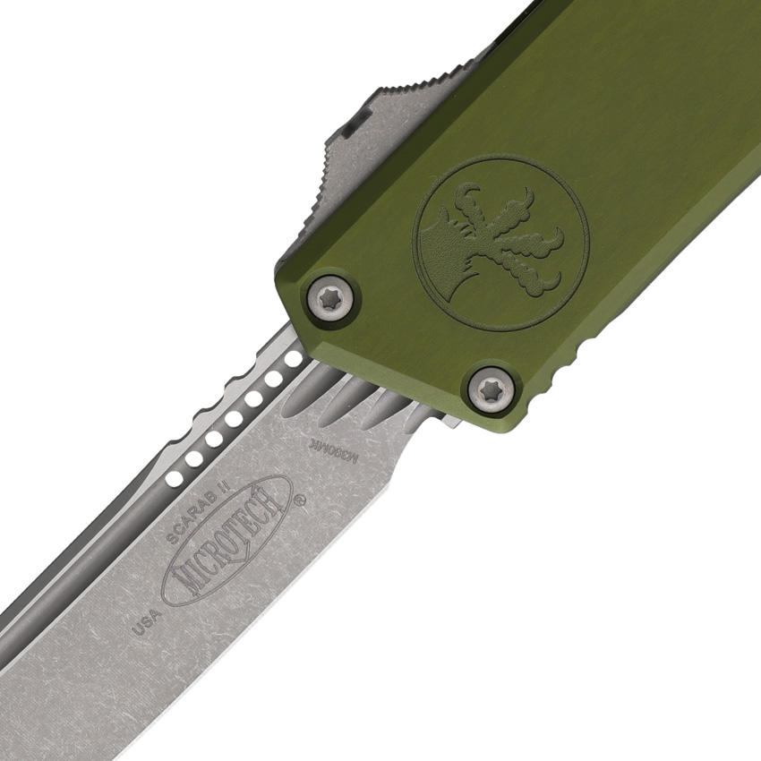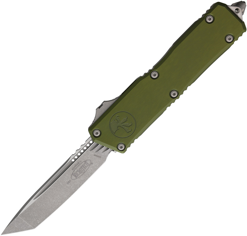 Automatic opening. 5.75″ (14.61cm) closed. 3.9″ (9.91cm) Apocalyptic finish Bohler M390MK stainless tanto blade. OD green aluminum handle. Glass breaker. Lanyard hole. Pocket clip. Boxed.