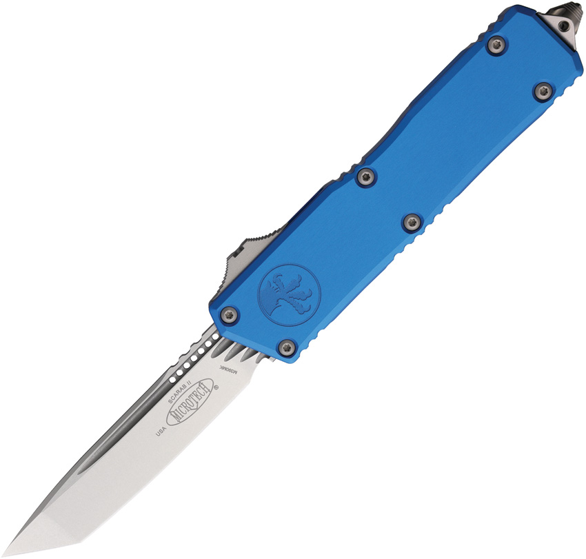 Automatic opening. 5.75″ (14.61cm) closed. 3.9″ (9.91cm) stonewash finish Bohler M390MK stainless tanto blade. Blue aluminum handle. Glass breaker. Lanyard hole. Pocket clip. Boxed.