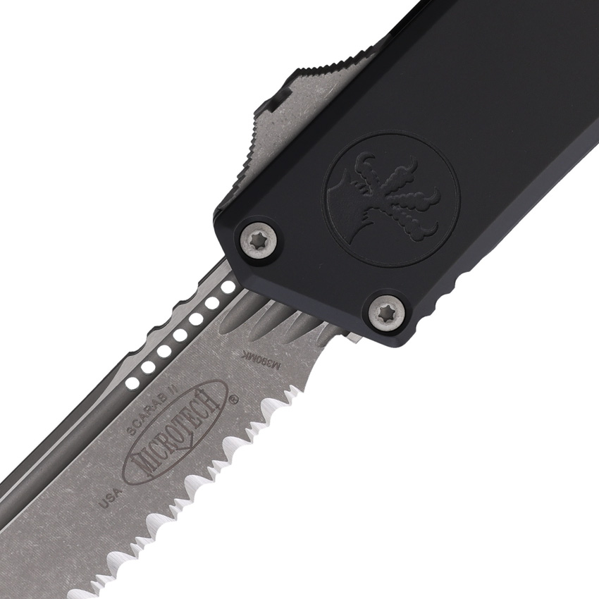 Automatic opening. 5.75″ (14.61cm) closed. 3.9″ (9.91cm) Apocalyptic finish serrated Bohler M390MK stainless tanto blade. Black aluminum handle. Glass breaker. Lanyard hole. Pocket clip. Boxed.