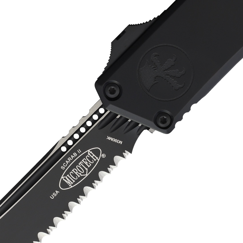 Automatic opening. 5.75″ (14.61cm) closed. 3.9″ (9.91cm) black finish serrated Bohler M390MK stainless tanto blade. Black aluminum handle. Glass breaker. Lanyard hole. Pocket clip. Boxed.