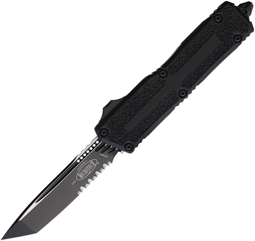 Automatic opening. 5.75″ (14.61cm) closed. 3.9″ (9.91cm) two-tone finish partially serrated Bohler M390MK stainless tanto blade. Black aluminum handle with black traction insert. Glass breaker. Lanyard hole. Pocket clip. Boxed.