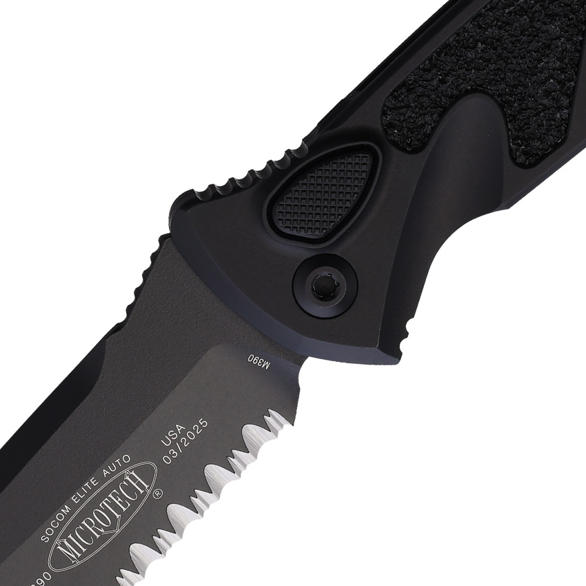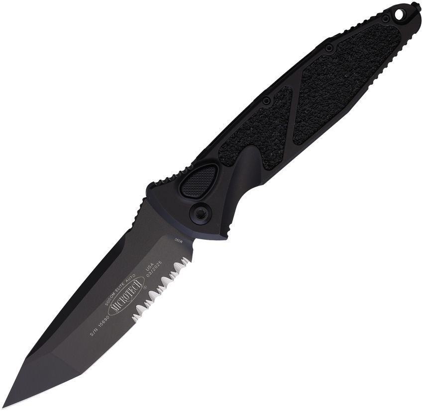 Automatic opening. 5.13″ (13.03cm) closed. 4″ (10.16cm) black finish partially serrated Bohler M390MK stainless tanto blade. Black aluminum handle with black traction insert. Thumb stud. Lanyard hole. Glass breaker. Pocket clip. Boxed.