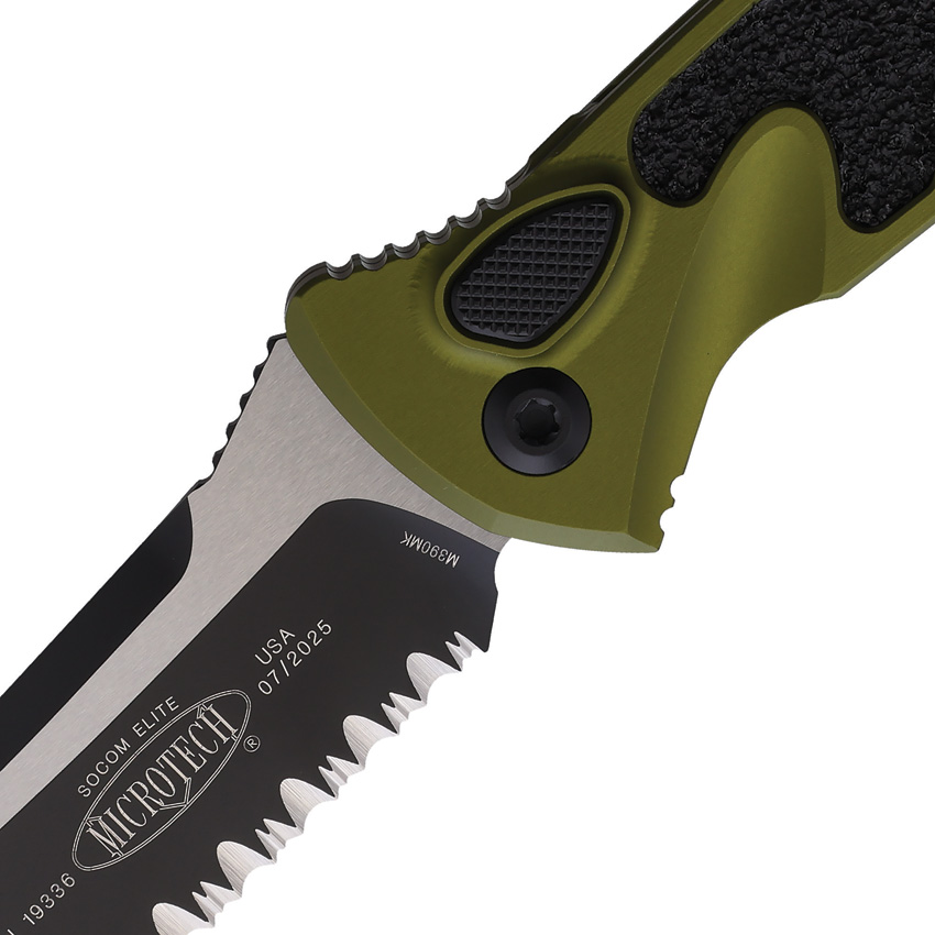 Automatic opening. 5.13″ (13.03cm) closed. 4″ (10.16cm) two-tone finish partially serrated premium steel blade. OD green aluminum handle with black traction insert. Thumb stud. Lanyard hole. Glass breaker. Pocket clip. Boxed.