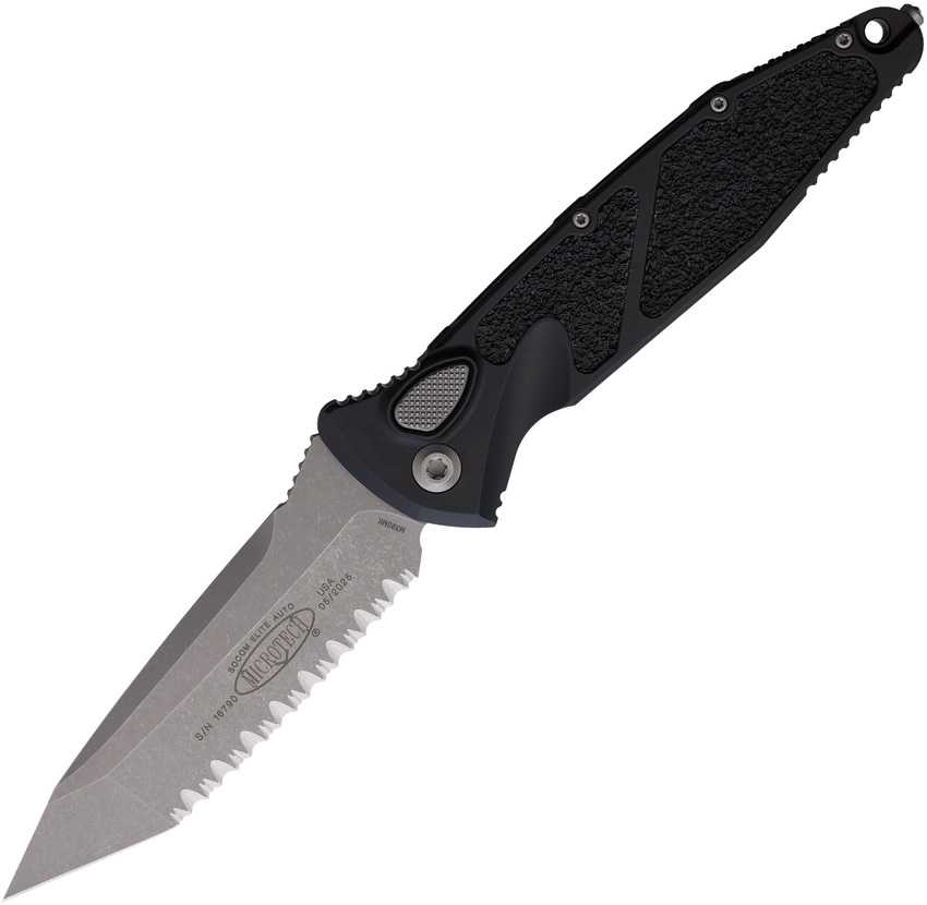 Automatic opening. 5.13″” (13.03cm) closed. 4″” (10.16cm) Apocalyptic finish serrated Bohler M390MK stainless tanto blade. Black aluminum handle with black traction insert. Thumb stud. Lanyard hole. Glass breaker. Pocket clip. Boxed.
