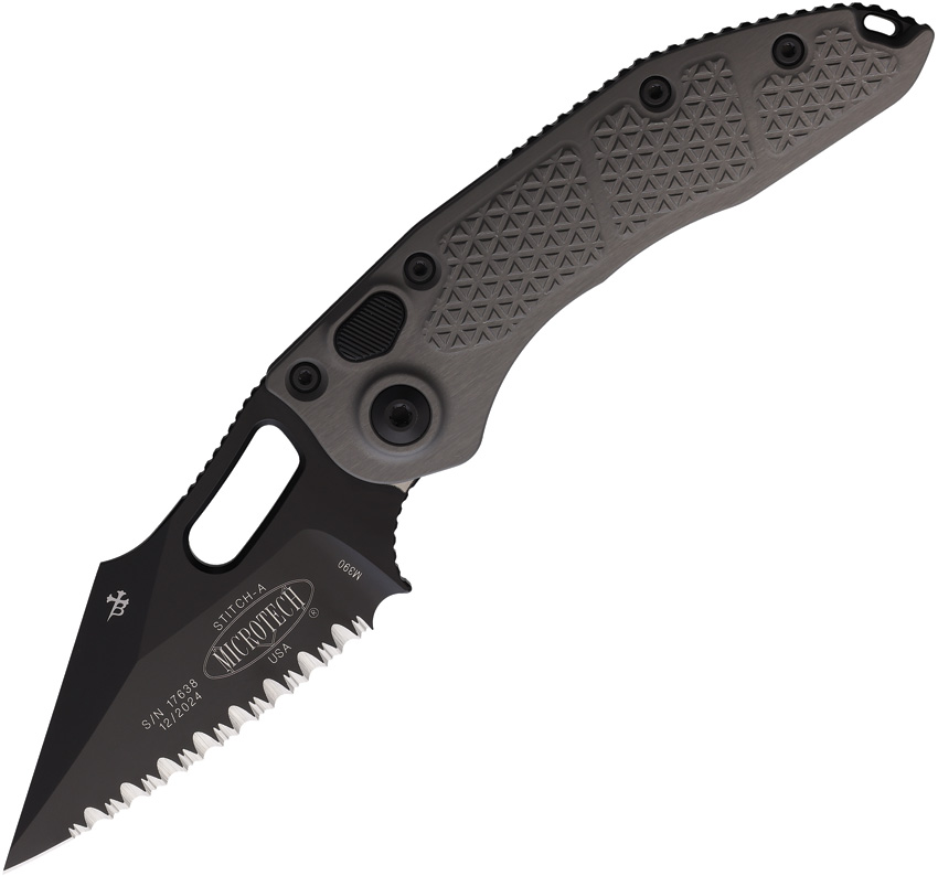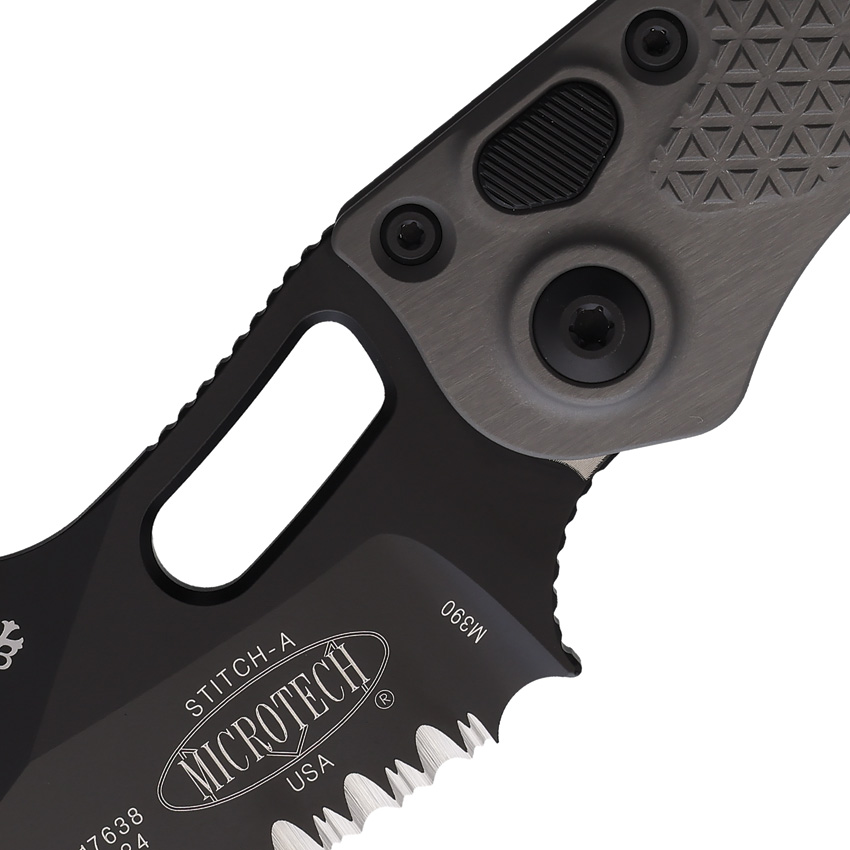 The Microtech Knives Auto Stitch S/E Tactical FS features a 3.75″” black finish serrated blade made from Bohler M390MK stainless steel. This high-quality material ensures long-lasting sharpness and excellent corrosion resistance. The knife’s gray aluminum handle is both sturdy and lightweight, providing a comfortable grip for extended use.