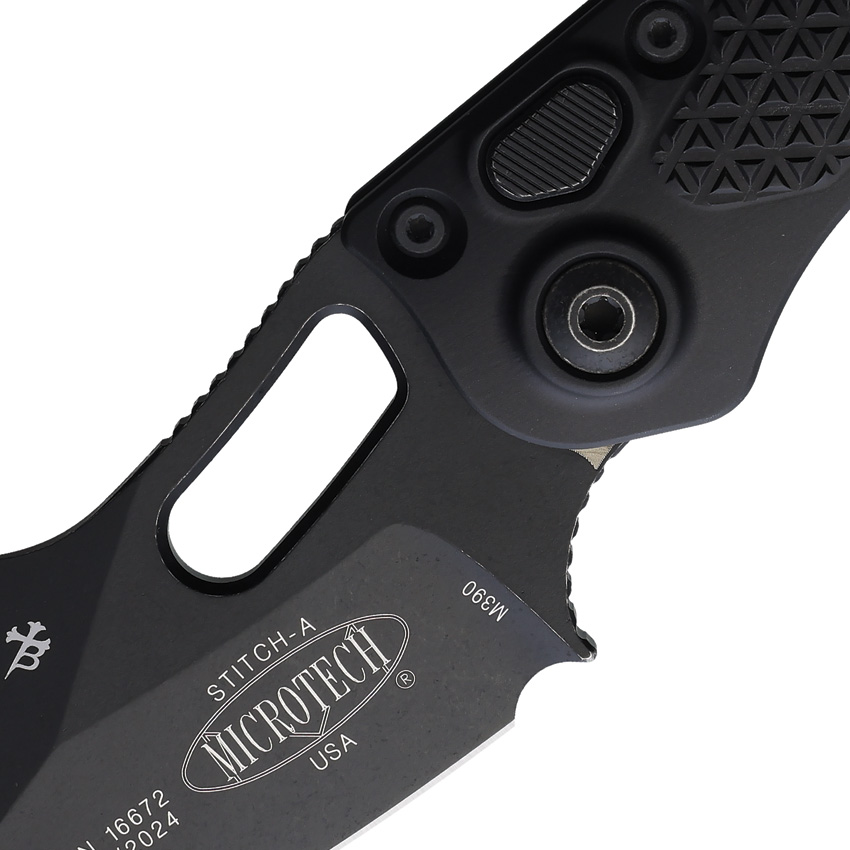 Microtech Stitch Automatic Knife Black Aluminum, a robust and reliable tool designed for tactical use. This knife is a production version of the custom knife collaboration between Marfione Custom Knives and Borka Blades, offering superior quality and performance.