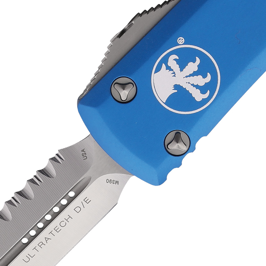 Automatic opening. 4.38″ (11.13cm) closed. 3.13″ (7.95cm) satin finish serrated premium steel dagger blade. Blue aluminum handle. Glass breaker. Lanyard hole. Pocket clip. Double edge blade. Boxed.