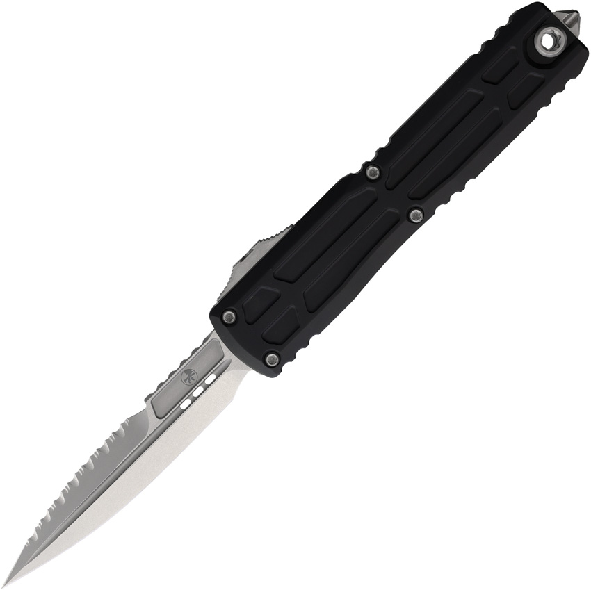 Automatic opening. 5″ (12.7cm) closed. 3.5″ (8.89cm) stonewash finish premium steel blade. Black aluminum handle. Lanyard hole. Glass breaker. Pocket clip. Bayonet style blade. Zero Blade Play. Boxed.