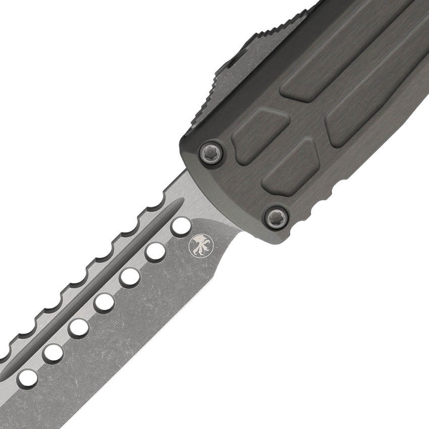 Automatic opening. 5″ (12.7cm) closed. 3.5″ (8.89cm) Apocalyptic finish Bohler M390MK stainless modified tanto blade. Gray aluminum handle. Glass breaker. Lanyard hole. Pocket clip. Hellhound Series. Features: Crud Kutter; Dual-Fuel Drive Train; Zero Blade Play. Boxed.