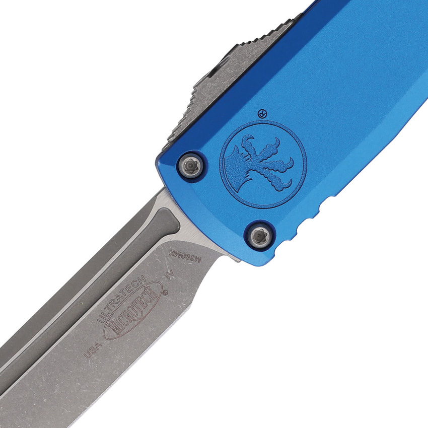 Automatic opening. 5″ (12.7cm) closed. 3.5″ (8.89cm) Apocalyptic finish Bohler M390MK stainless tanto blade. Blue aluminum handle. Pocket clip. Lanyard hole. Glass breaker. Boxed.