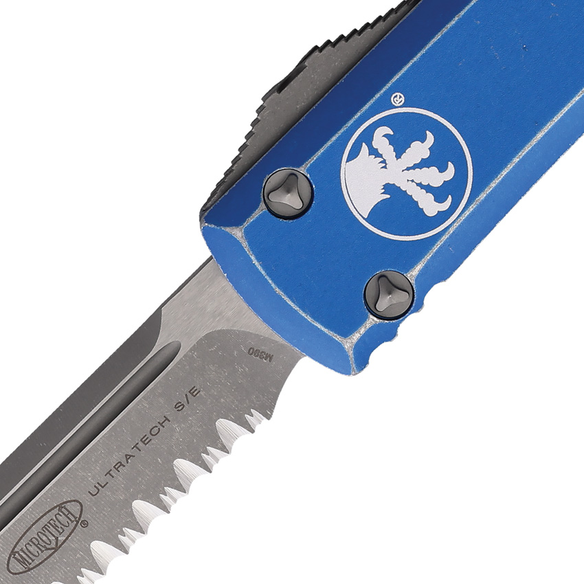 Microtech Ultratech S/E OTF Automatic Knife Distressed Blue (3.4″” Apoc Serr), a quintessential out-the-front (OTF) automatic knife. This knife is designed for those who demand superior quality and functionality in their everyday carry gear. Expect top-shelf materials, flawless fit and finish, and innovative design.