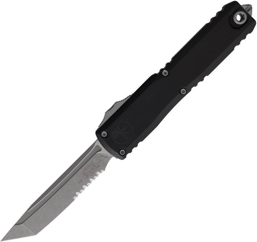 Automatic opening. 5″ (12.7cm) closed. 3.5″ (8.89cm) Apocalyptic finish partially serrated Bohler M390MK stainless tanto blade. Black aluminum handle. Glass breaker. Lanyard hole. Pocket clip. Boxed.