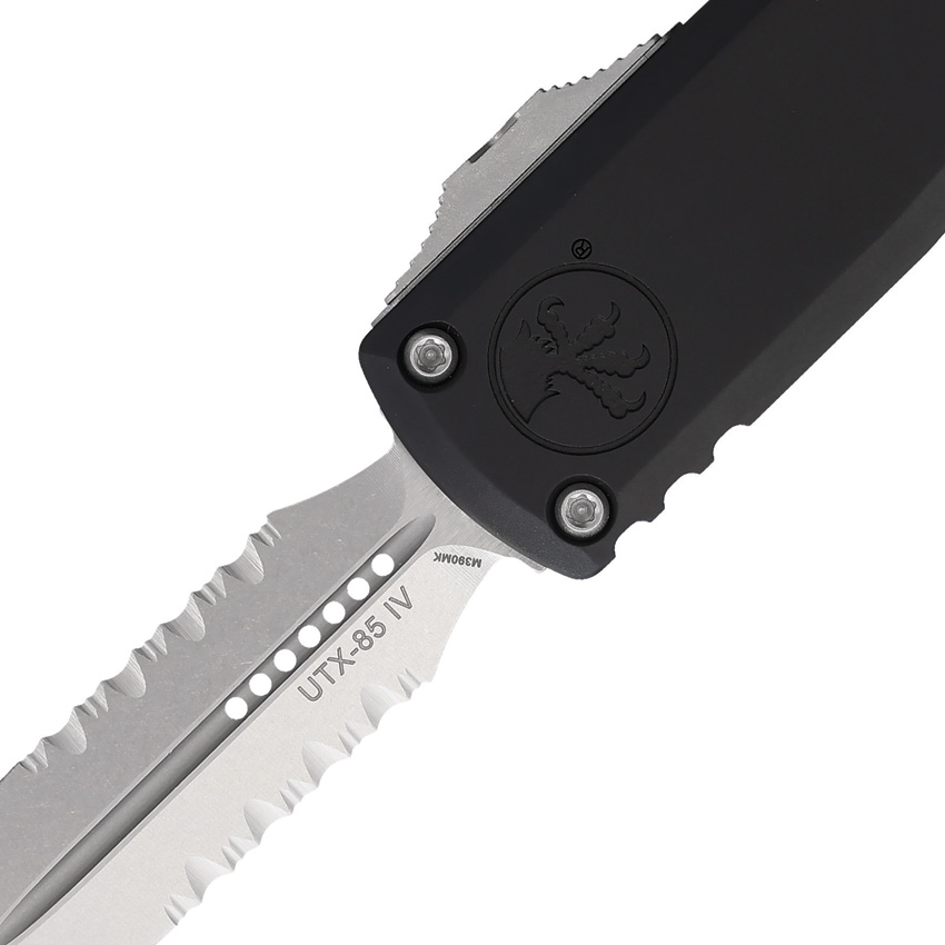 Automatic opening. 4.5″ (11.43cm) closed. 3.13″ (7.95cm) stonewash finish partially serrated Bohler M390MK stainless dagger blade. Black aluminum handle. Glass breaker. Lanyard hole. Pocket clip. Boxed.