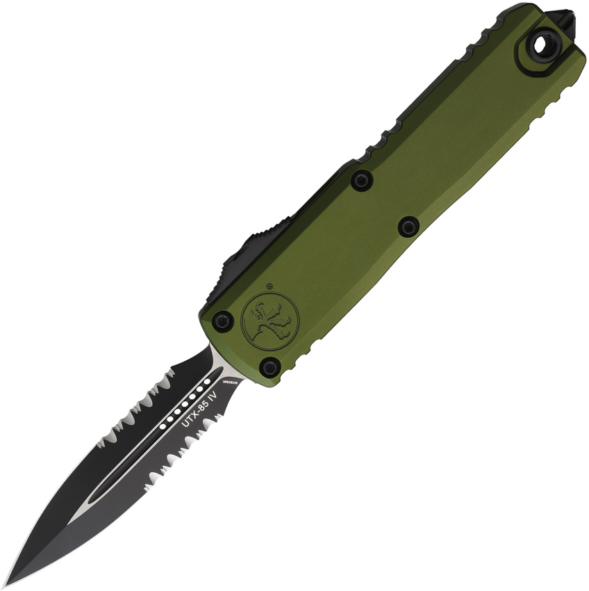 Automatic opening. 4.63″ (11.76cm) closed. 3″ (7.62cm) two-tone finish partially serrated Bohler M390MK stainless dagger blade. OD green aluminum handle. Pocket clip. Lanyard hole. Glass breaker. Double edge blade. Boxed.