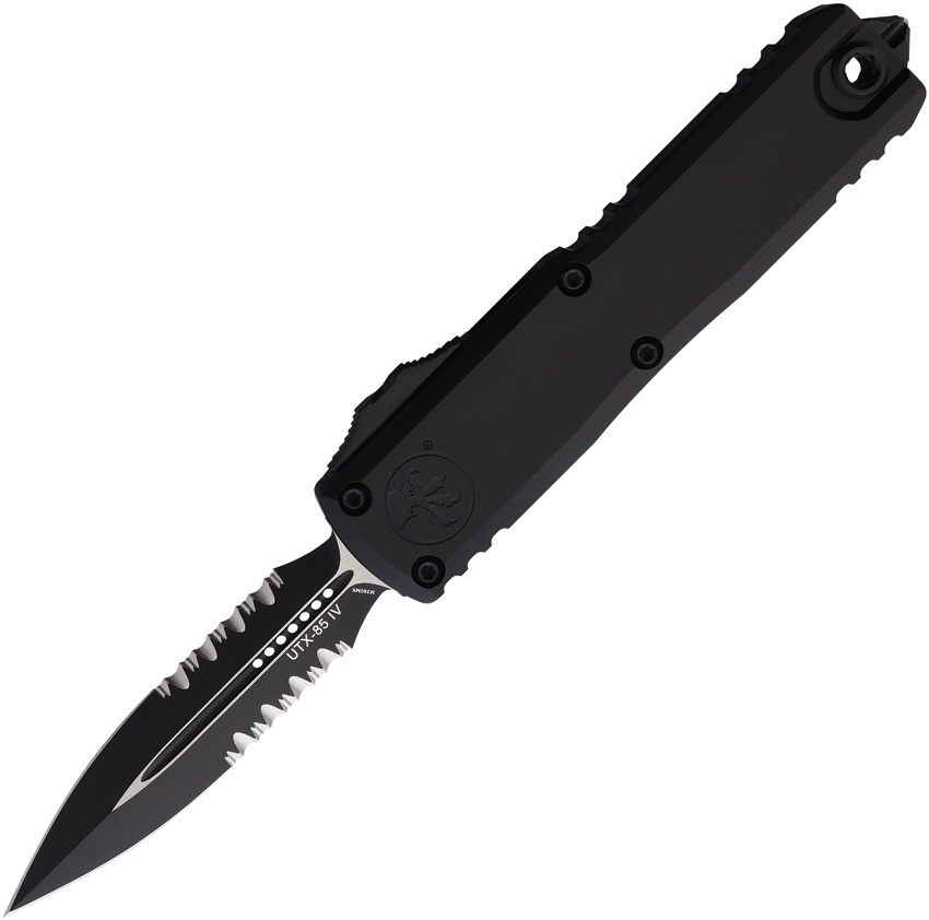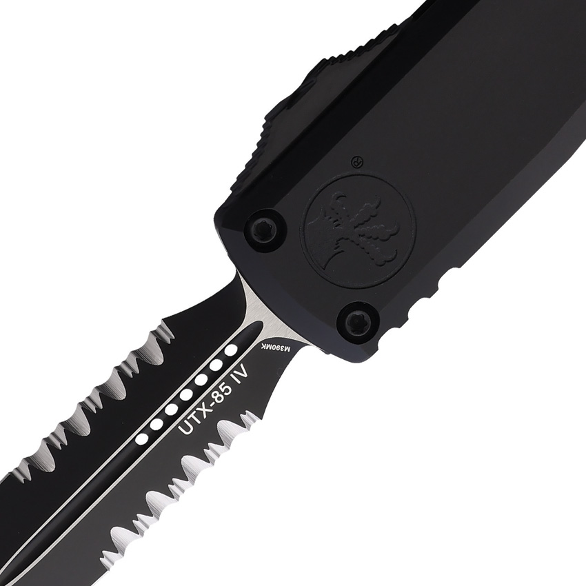 Automatic opening. 4.5″ (11.43cm) closed. 3.13″ (7.95cm) two-tone finish partially serrated Bohler M390MK stainless dagger blade. Black aluminum handle. Glass breaker. Lanyard hole. Pocket clip. Boxed.