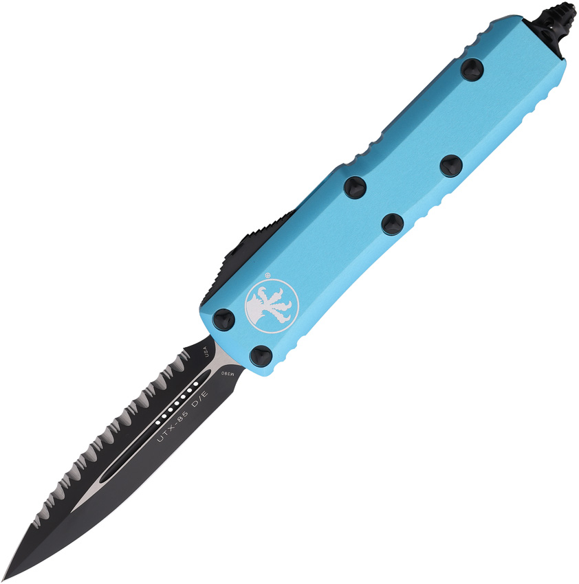 Microtech UTX-85 D/E OTF Automatic Knife Turquoise, a compact yet powerful tool designed for everyday carry and tactical use. This knife is a smaller version of the renowned Ultratech, maintaining the same premium materials and reliable action in a more compact package.