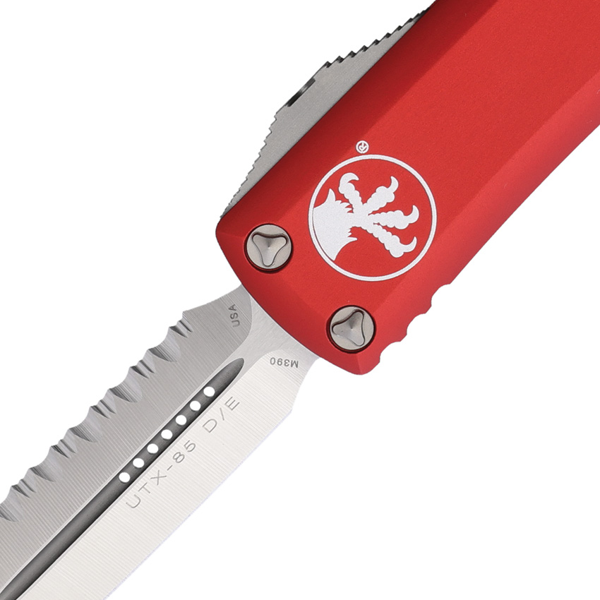 Microtech Knives Auto UTX-85 D/E OTF FS Red, an automatic knife designed for precision and reliability. Crafted in the USA, this knife is a testament to Microtech’s commitment to superior quality and performance. With its satin finish and red aluminum handle, it is as visually striking as it is functional.