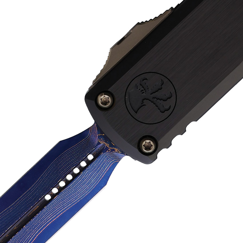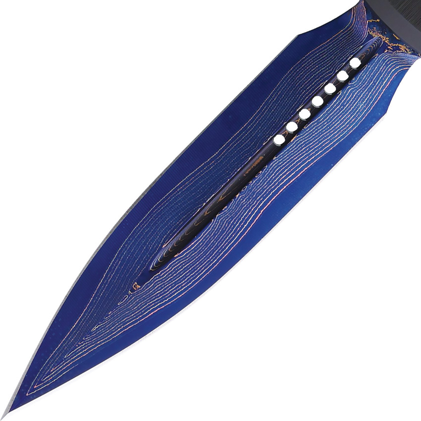 Automatic opening. 4.63″ (11.76cm) closed. 3″ (7.62cm) blade. Black aluminum handle. Lanyard hole. Pocket clip. Glass breaker. Blue Baker Forge Coppermai Damascus double edge dagger blade. Bronze and blue finish accents. Boxed.