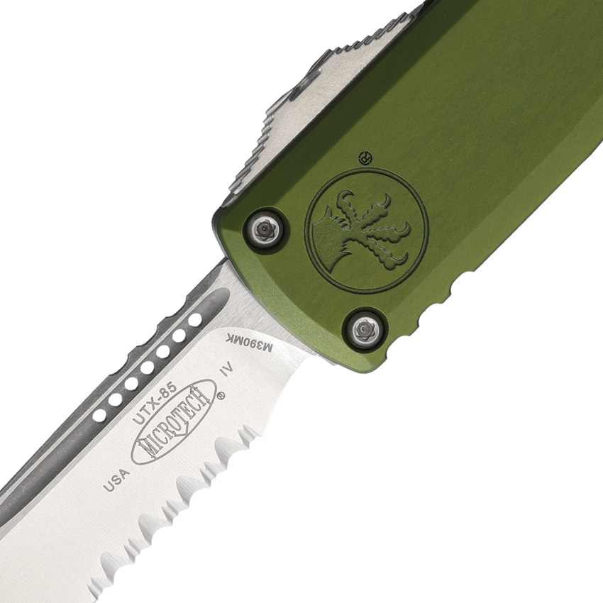 Automatic opening. 4.63″ (11.76cm) closed. 3″ (7.62cm) stonewash finish partially serrated Bohler M390MK stainless blade. OD green aluminum handle. Pocket clip. Lanyard hole. Glass breaker. Boxed.
