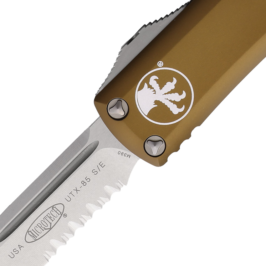 Automatic opening. 4.38″ (11.13cm) closed. 3.13″ (7.95cm) stonewash finish partially serrated premium steel blade. Tan aluminum handle. Glass breaker. Lanyard hole. Pocket clip. Boxed.