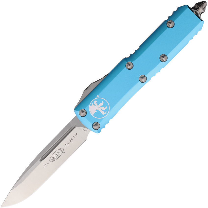 Automatic opening. 4.38″ (11.13cm) closed. 3.13″ (7.95cm) satin finish premium steel blade. Turquoise aluminum handle. Glass breaker. Lanyard hole. Pocket clip. Boxed.
