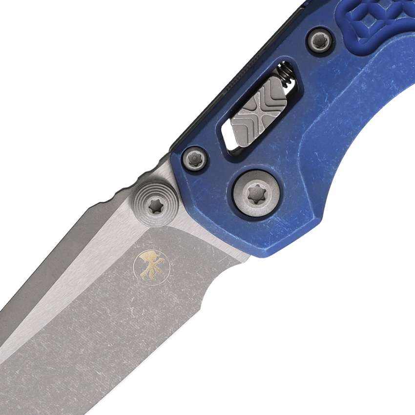 4.25″ (10.8cm) closed. 3.25″ (8.26cm) Apocalyptic finish Bohler M390MK stainless sheepsfoot blade. Antique blue frag pattern titanium handle. Pocket clip. Thumb pull. Lanyard hole. Marfione Select. Blue titanium and Apocalyptic stainless accents. Boxed.