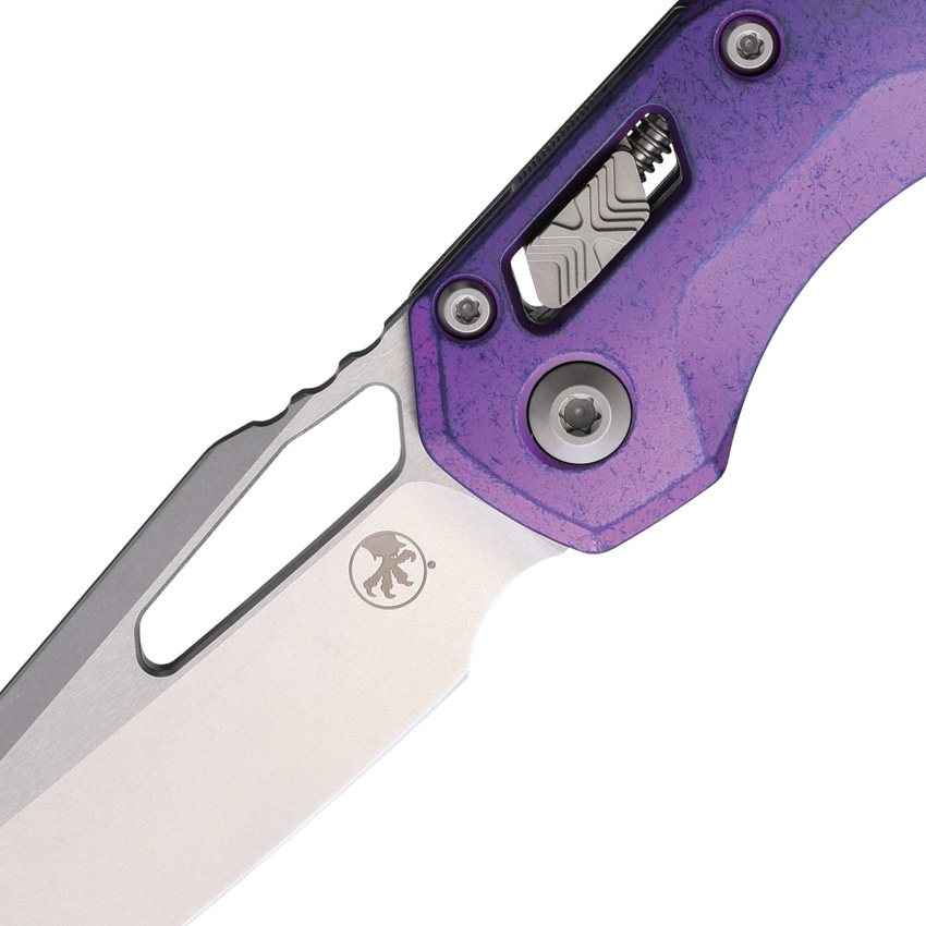 5″ (12.7cm) closed. 3.75″ (9.53cm) stonewash finish Bohler M390MK stainless sheepsfoot blade. Purple Haze smooth titanium handle. Thumb pull. Lanyard hole. Pocket clip. Marfione Select. Purple titanium and double blast vapor stainless accents. Boxed.