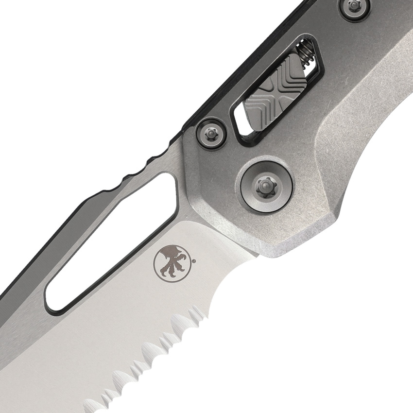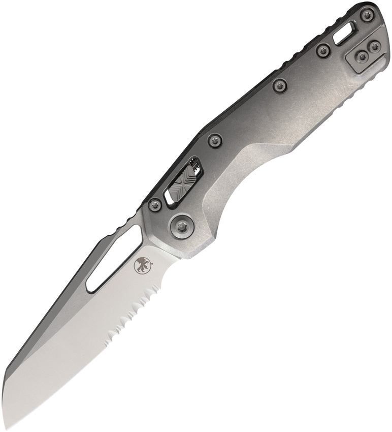 5″ (12.7cm) closed. 3.75″ (9.53cm) stonewash finish partially serrated Bohler M390MK stainless sheepsfoot blade. Stonewash titanium handle. Thumb pull. Lanyard hole. Pocket clip. Marfione Select. Bronze titanium and double blast vapor stainless accents. Boxed.