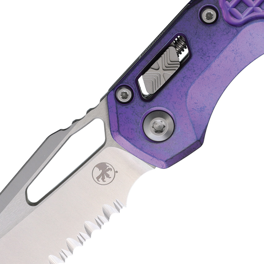 5″ (12.7cm) closed. 3.75″ (9.53cm) stonewash finish partially serrated Bohler M390MK stainless sheepsfoot blade. Purple Haze frag pattern titanium handle. Thumb pull. Lanyard hole. Pocket clip. Marfione Select. Purple titanium and double blast vapor stainless accents. Boxed.