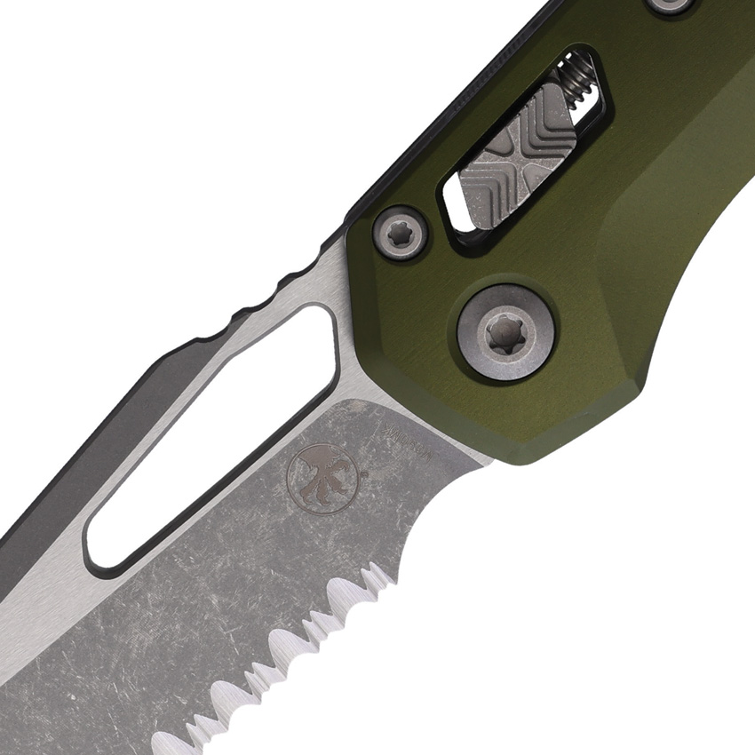 The Microtech Knives MSI Ram-Lok AP OD is a USA-made knife that boasts a 5″” closed length and a 3.75″” blade length. The sheepsfoot blade, made from Bohler M390MK, is serrated and finished with an apocalyptic touch, adding to its unique appeal. The handle, made from aluminum, is colored in OD green, providing a comfortable grip and a striking aesthetic.
