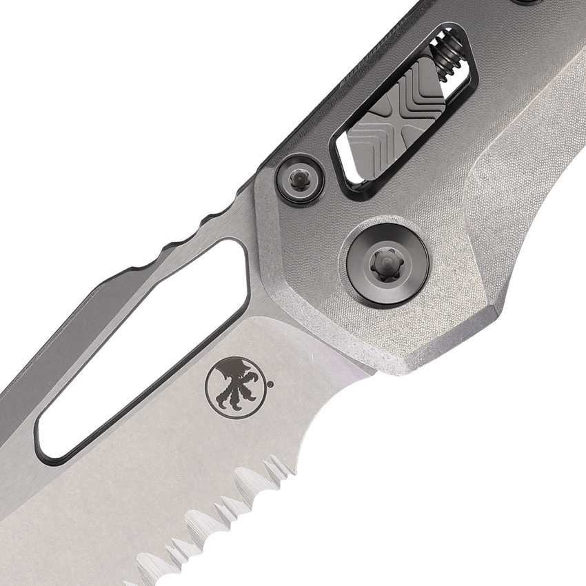 5″ (12.7cm) closed. 3.75″ (9.53cm) stonewash finish partially serrated sheepsfoot blade. Stonewash titanium handle. Thumb pull. Lanyard hole. Pocket clip. Marfione Select edition. Blue titanium accents. Double vapor blast stainless blade. Boxed.