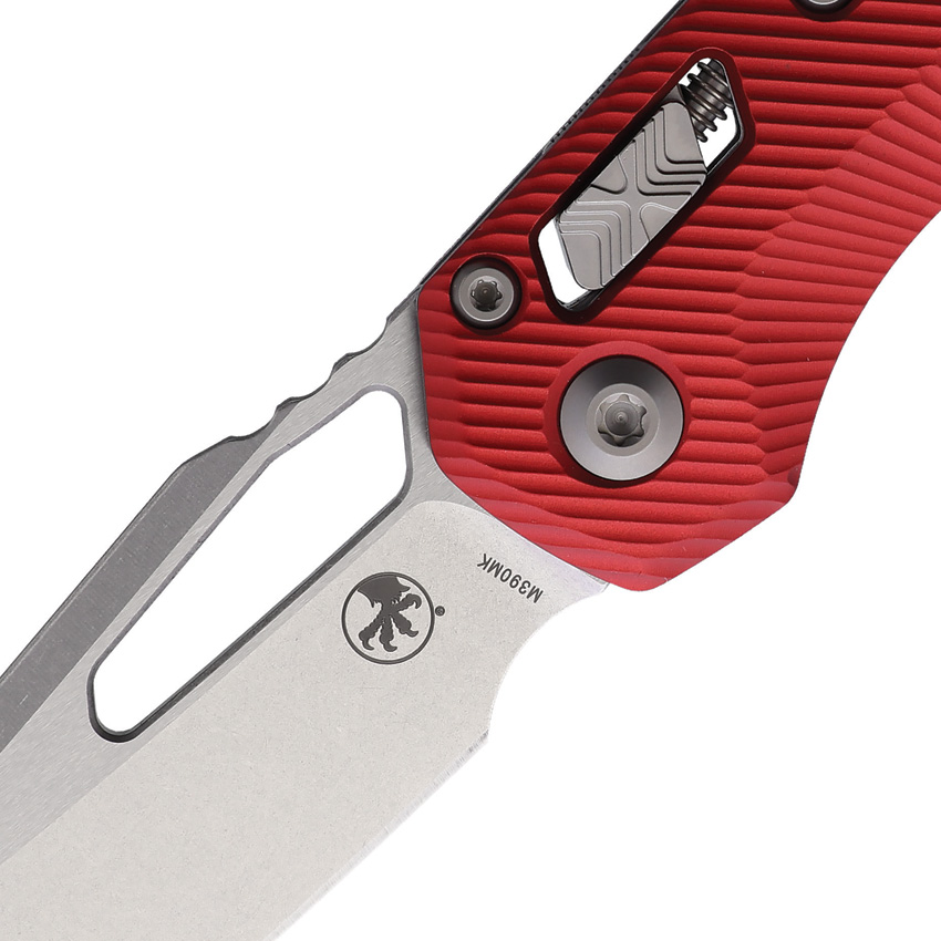 The Microtech Knives MSI Ram-Lok SW Red features a 3.75-inch stonewash finish Bohler M390MK stainless sheepsfoot blade. The handle is made from red fluted aluminum, providing a secure grip and a striking aesthetic. The knife also includes a thumb pull for easy opening, a lanyard hole, and a pocket clip for convenient carry.