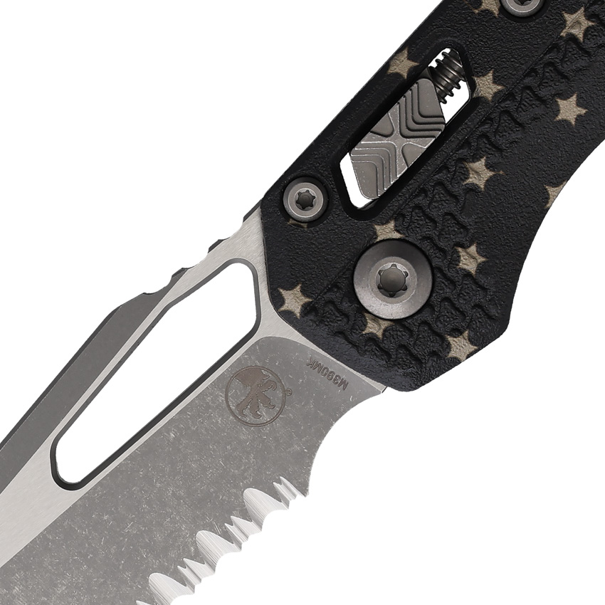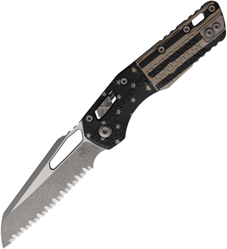 5″ (12.7cm) closed. 3.75″ (9.53cm) Apocalyptic finish serrated Bohler M390MK stainless sheepsfoot blade. Black polymer handle. Thumb pull. Lanyard hole. Pocket clip. Flag handle artwork. Boxed.
