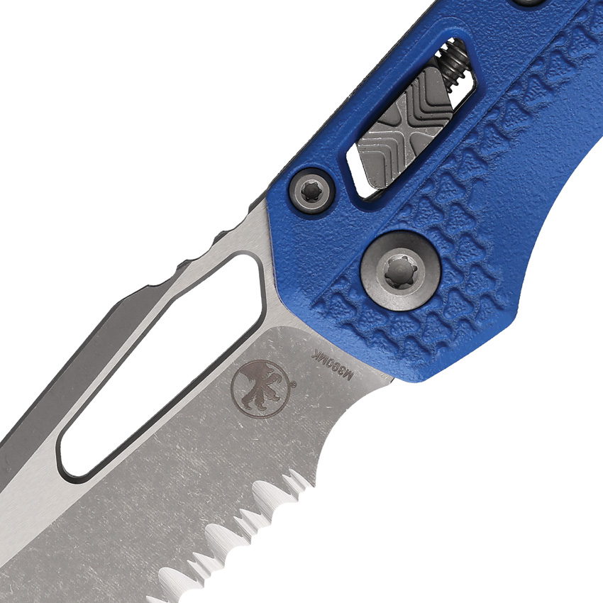 5″ (12.7cm) closed. 3.75″ (9.53cm) Apocalyptic finish serrated Bohler M390MK stainless sheepsfoot blade. Blue polymer handle. Thumb pull. Lanyard hole. Pocket clip. Boxed.