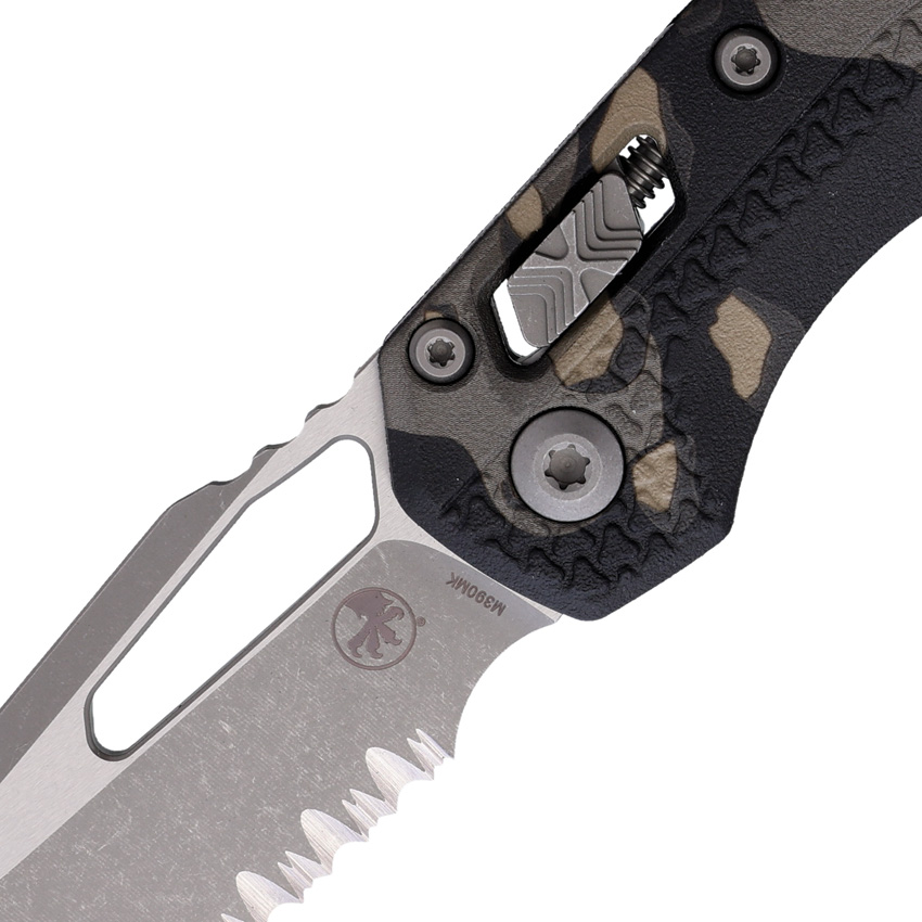 5″ (12.7cm) closed. 3.75″ (9.53cm) Apocalyptic finish partially serrated Bohler M390MK stainless sheepsfoot blade. Tactical camo Tri-Grip polymer handle. Thumb pull. Lanyard hole. Pocket clip. Boxed.