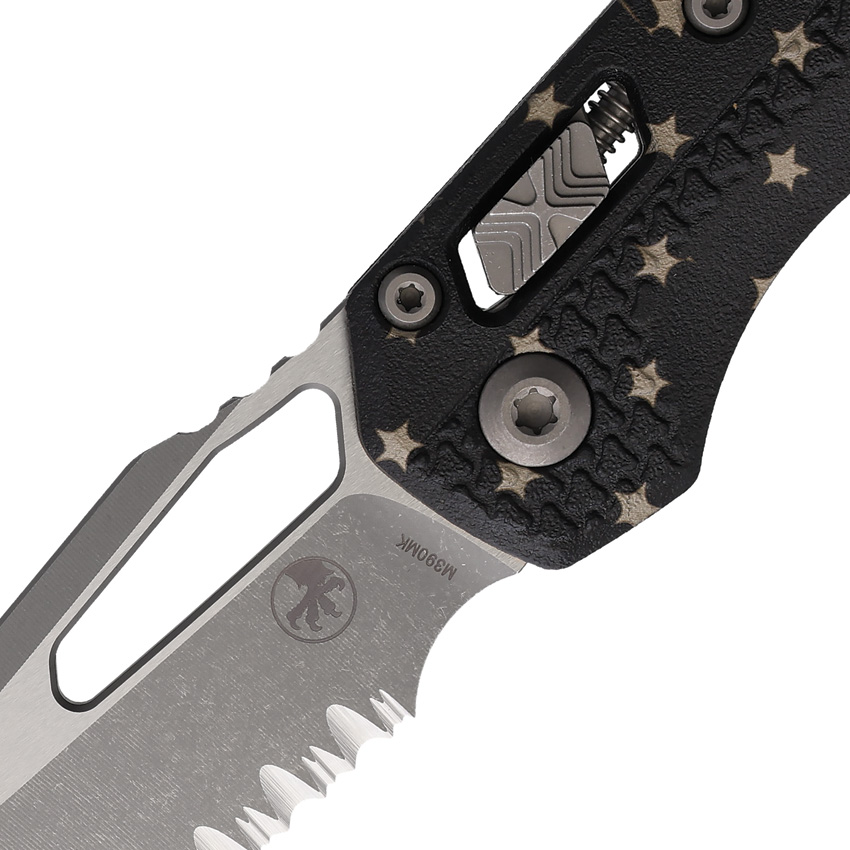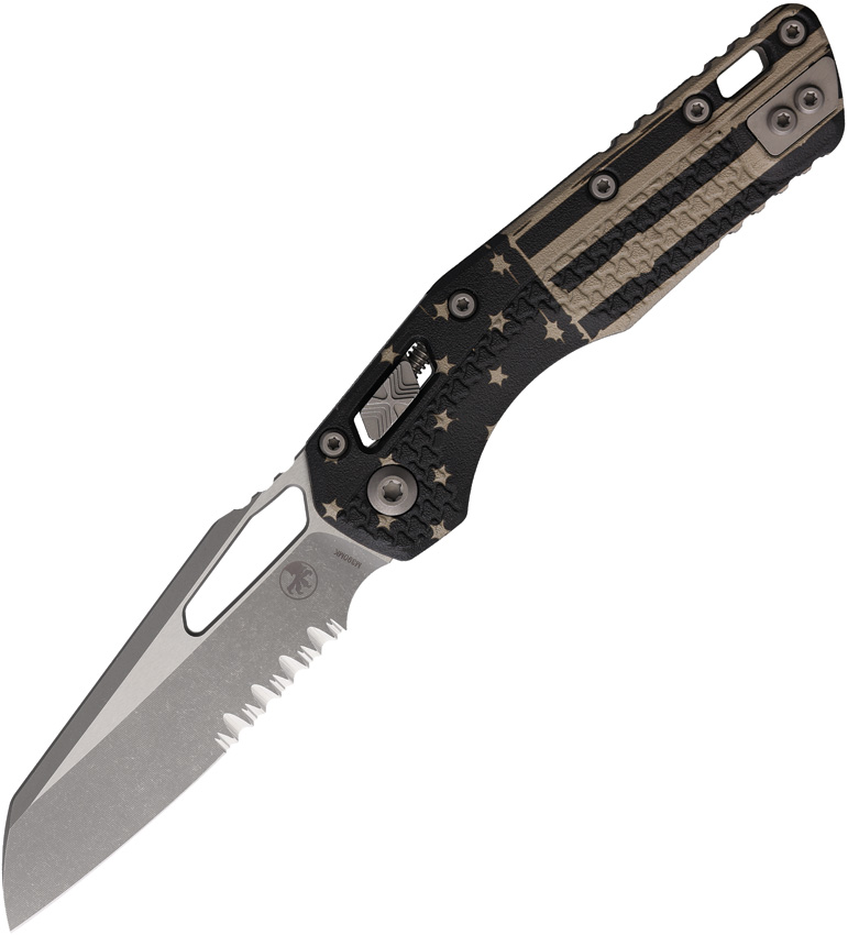 5″ (12.7cm) closed. 3.75″ (9.53cm) Apocalyptic finish partially serrated Bohler M390MK stainless sheepsfoot blade. Black Tri-Grip polymer handle. Thumb pull. Lanyard hole. Pocket clip. Flag handle artwork. Boxed.