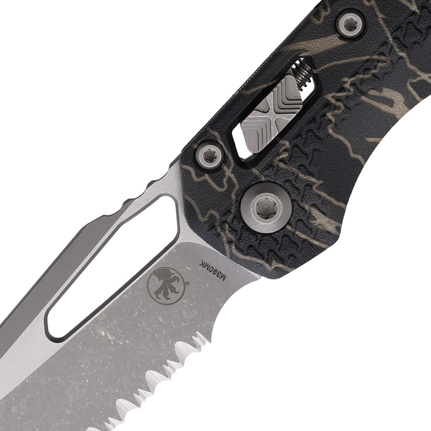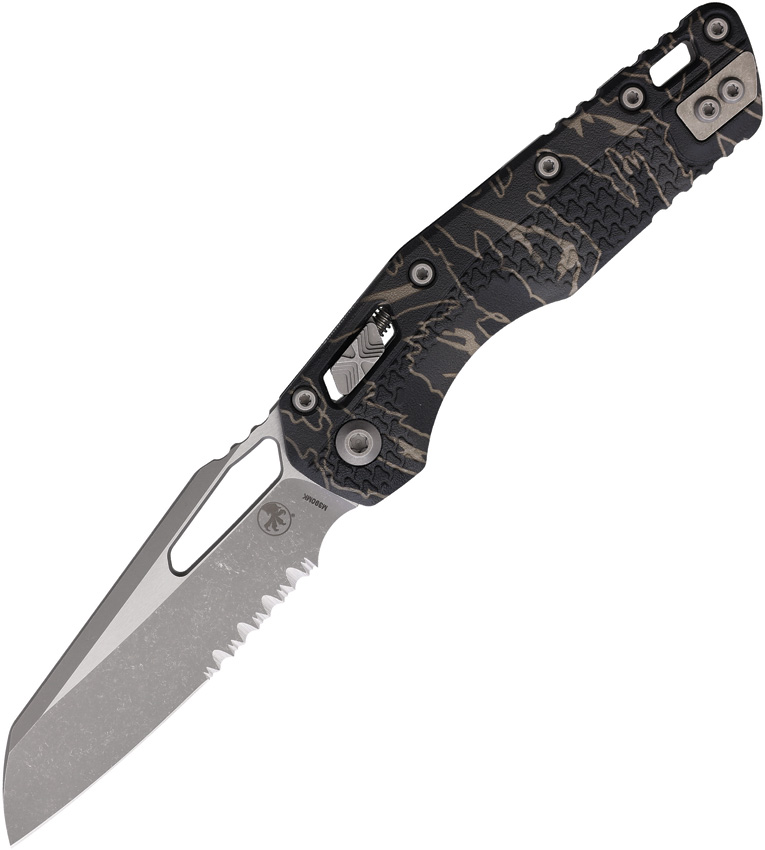 5″ (12.7cm) closed. 3.75″ (9.53cm) Apocalyptic finish partially serrated Bohler M390MK stainless sheepsfoot blade. Tiger striped camo polymer handle. Thumb pull. Lanyard hole. Pocket clip. Microtech item #210T-11APPMTSC. Boxed.