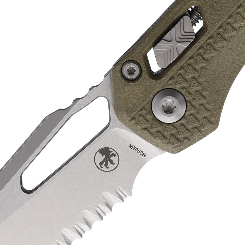 5″ (12.7cm) closed. 3.75″ (9.53cm) stonewash finish partially serrated Bohler M390MK stainless sheepsfoot blade. OD green Tri-Grip polymer handle. Thumb pull. Lanyard hole. Pocket clip. Boxed.