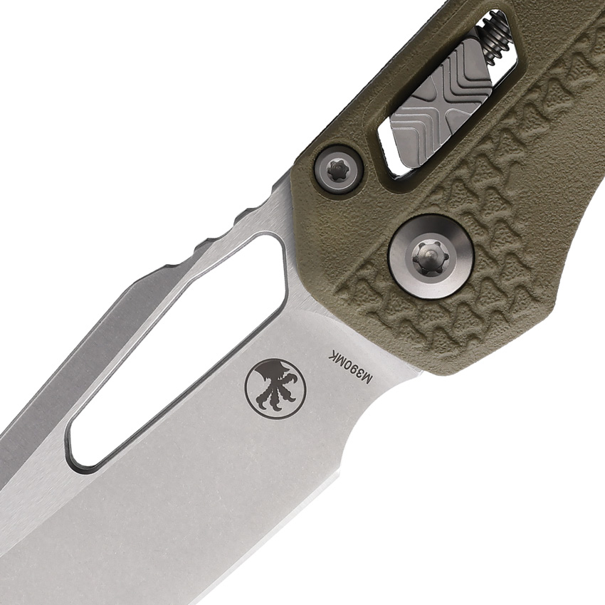 5″ (12.7cm) closed. 3.75″ (9.53cm) stonewash finish Bohler M390MK stainless sheepsfoot blade. OD green Tri-Grip polymer handle. Thumb pull. Lanyard hole. Pocket clip. Boxed.