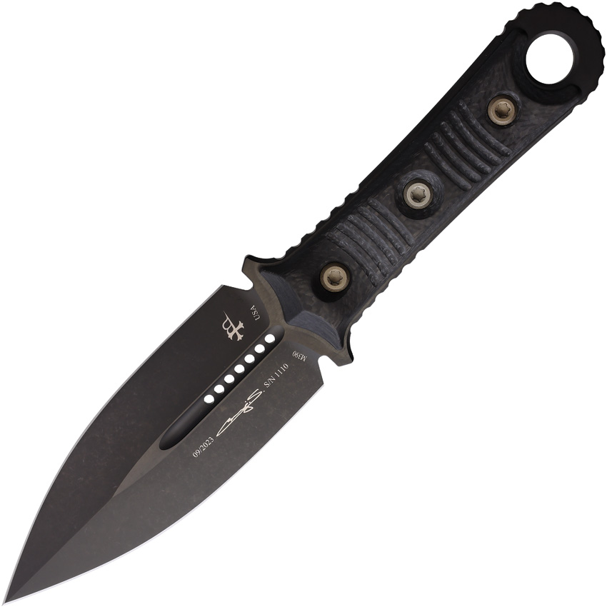 9″ (22.86cm) overall. 4.5″ (11.43cm) black DLC coated double edge premium steel dagger blade. Carbon fiber handle. Full, extended tang. Lanyard hole. Black carbon fiber belt sheath. Boxed.